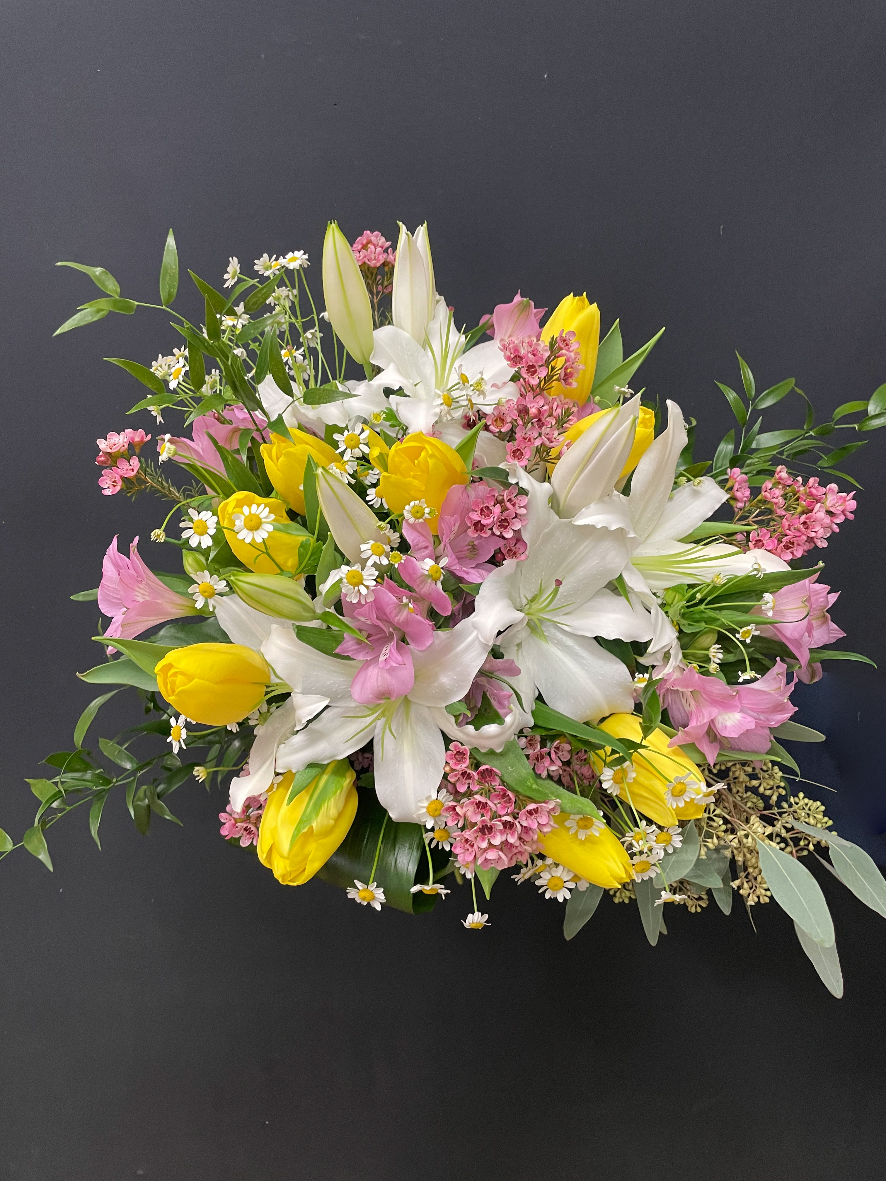Qual'ora non fossero disponibili i fiori presenti in foto verranno sostituiti, in base alla stagionalità, mantenendo le tonalità di colore e la qualità degli stessi.