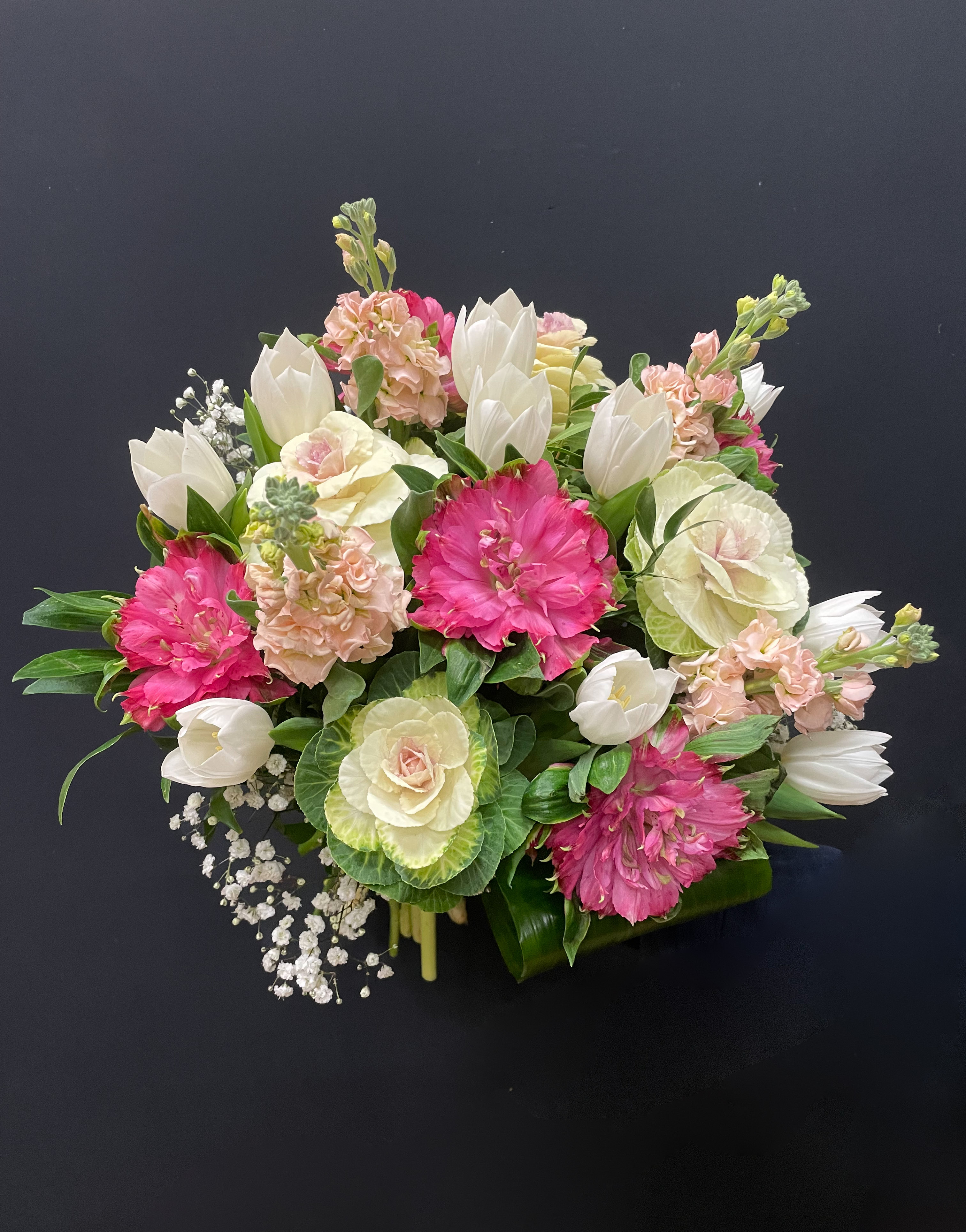Qual'ora non fossero disponibili i fiori presenti in foto verranno sostituiti, in base alla stagionalità, mantenendo le tonalità di colore e la qualità degli stessi.