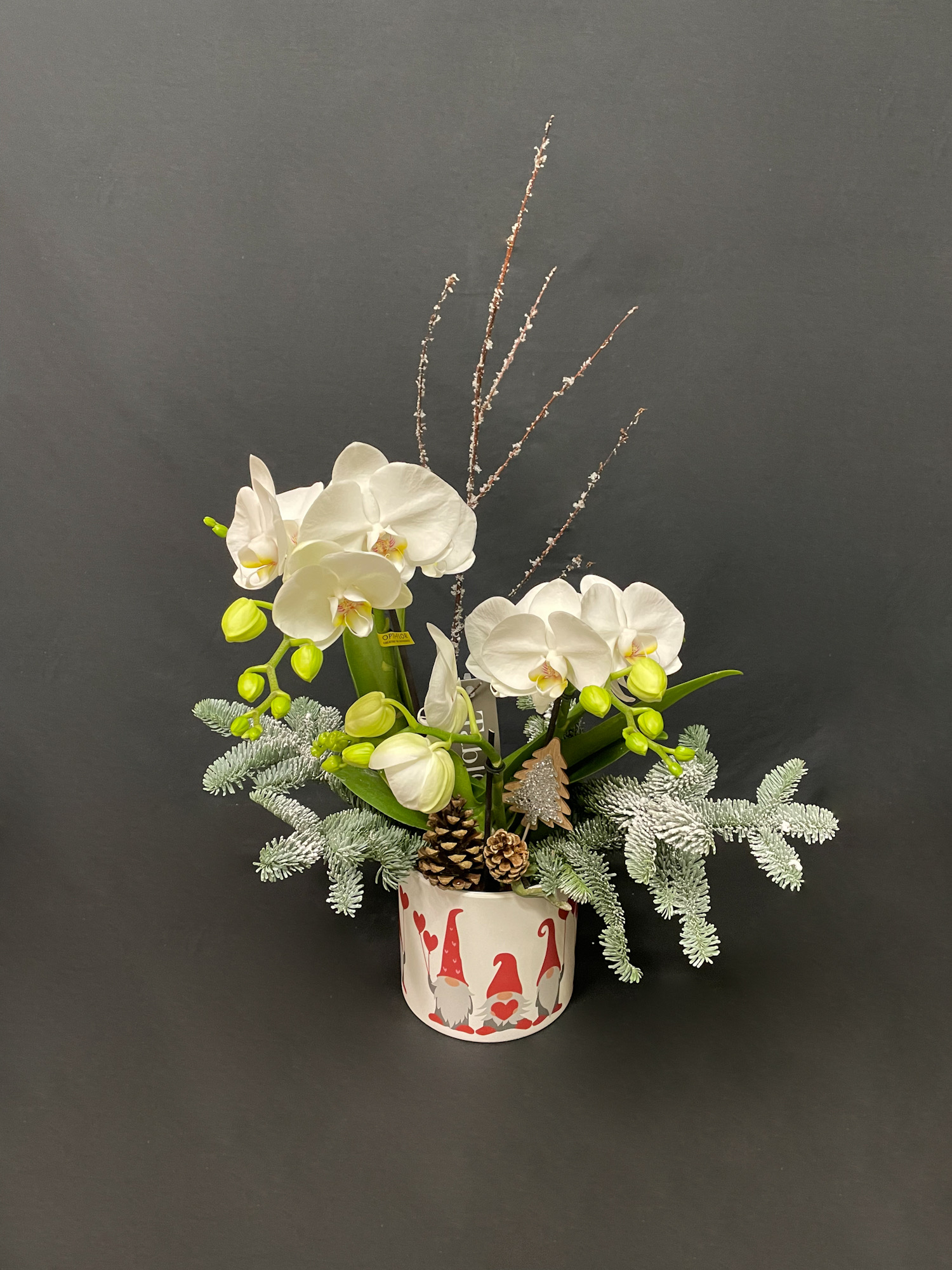 L'orchidea Phalaenopsis è sempre tra le più eleganti delle piante da regalare ed adatta ad ogni occasione; preparata con pino naturale e addobbi natalizi. Il prezzo è comprensivo di coprivaso come da foto. Per qualsiasi informazione o chiarimento contattaci allo 041-974270 oppure scrivi a fioreriasanmarco.mestre@gmail.com. Confezione regalo e bigliettino sono inclusi nel prezzo dell'omaggio. PER INFO SULLO STATO DELLA TUA CONSEGNA O SE VUOI RICEVERE UNA FOTO DEL TUO REGALO SCRIVI O CHIAMA AL 3203226287. PER CONSEGNE URGENTI IN GIORNATA CHIAMACI PRIMA DI EFFETTUARE L'ORDINE AL 041-974270;
