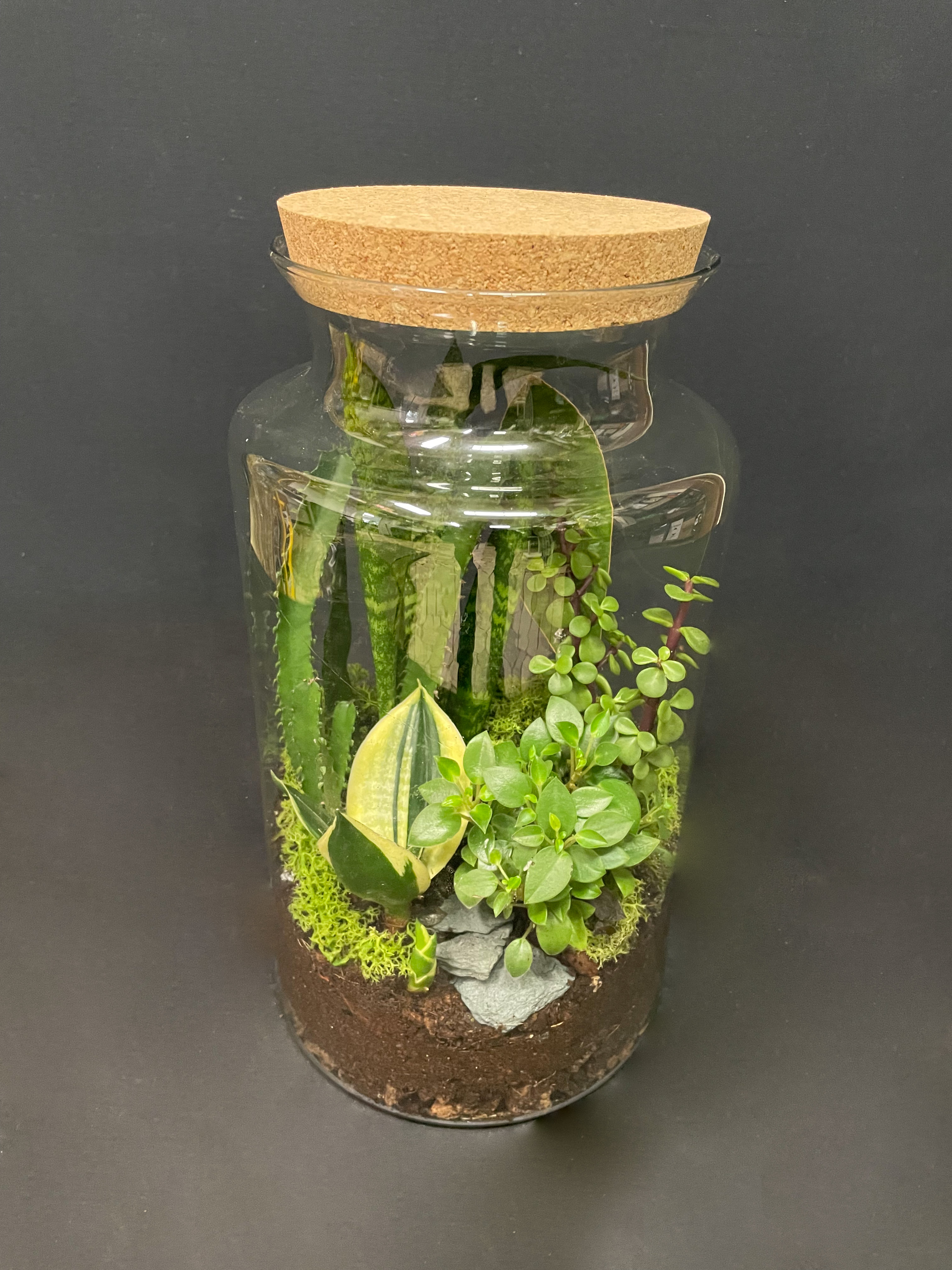 Composizione di piante succulente in contenitore di vetro con tappo in sughero, durature e di facile mantenimento.