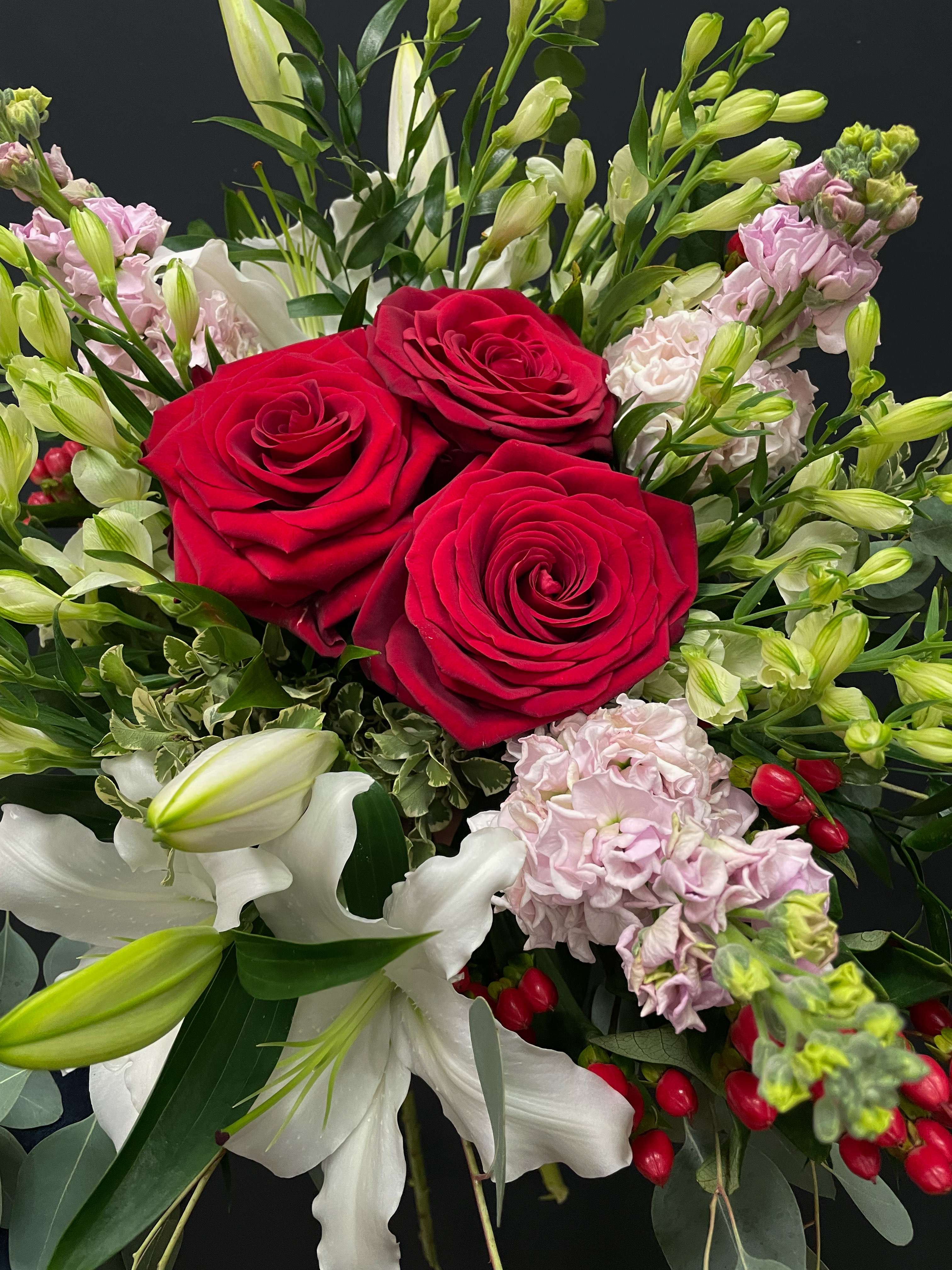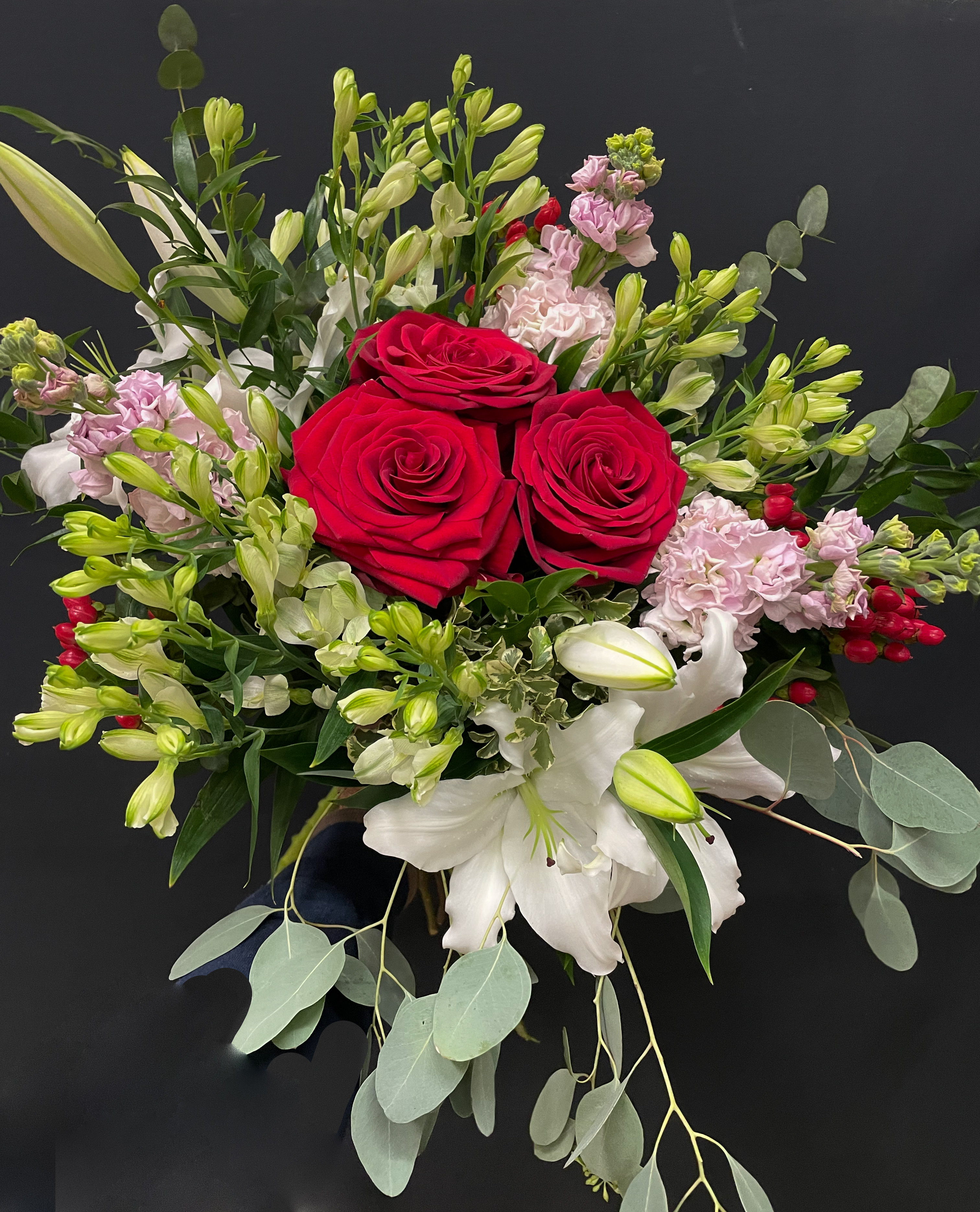 Bouquet con rose rosse, lilium ecc con verde decorativo.